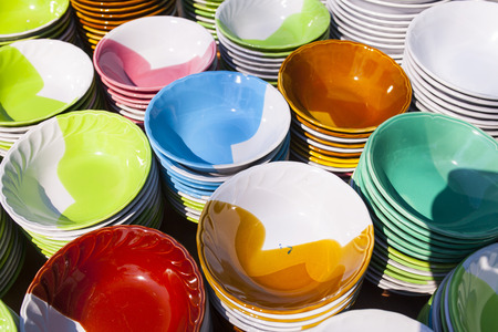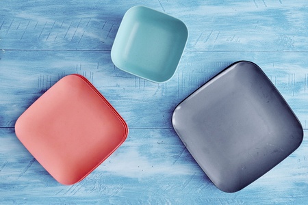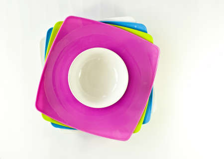 Different colors of empty plates. white background. Red, blue and yellow clay plate.