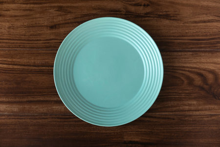 Top view of empty green plate on a wooden background. Flat lay, copy space.