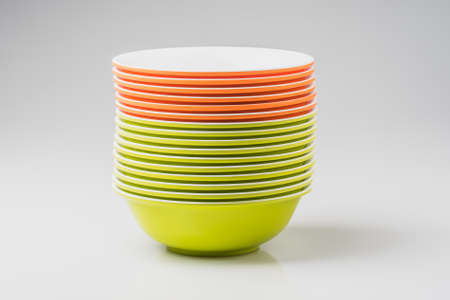 Plastic dishes on a cream background.
