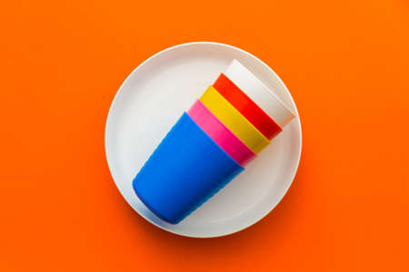 Children's unbreakable multicolored dishes, serving for a children's holiday. Isolated on an orange background