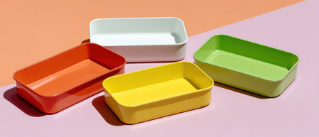 Colorful rectangular food tray set pastel surface featuring sustainable packaging design and cheerful composition evoking eco friendly lifestyle