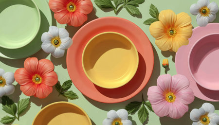 Colorful ceramic plates and bowls with pastel flowers and green leaves, bright spring tableware