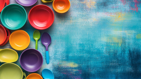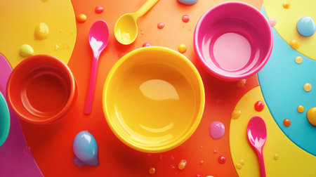 Brightly colored bowls and spoons arranged artistically on a vibrant background, perfect for conveying a cheerful and casual dining atmosphere.