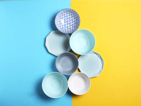 Empty ceramic tableware. Ceramic plates on yellow and blue background. Overview empty food table with tableware. Set of different modern white and blue plates and bowls.Top view, flat lay.Copy space.