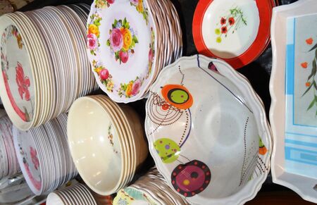 Close up stacks of Ceramic cup on a shelf.