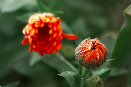 A bright, beautiful orange calendula flower blooms among dark leaves and grass on an autumn night. Nature and medicinal plants.