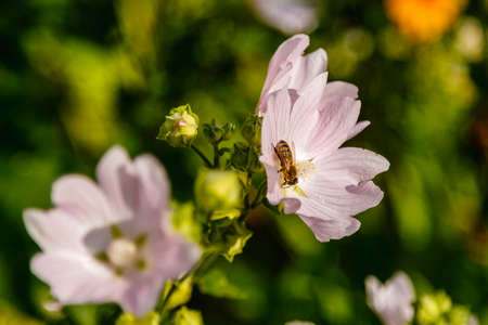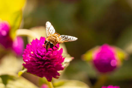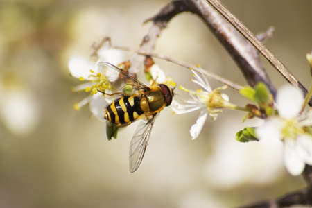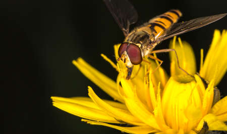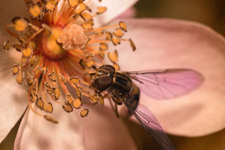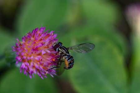 Macro Photography of Hoverfly Sucking Nectar from Flower Isolated on Blurry Background