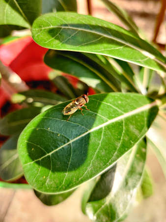 A small housefly insect sitting on a green leaf of a plant in the sun, macro photo.