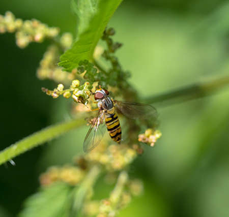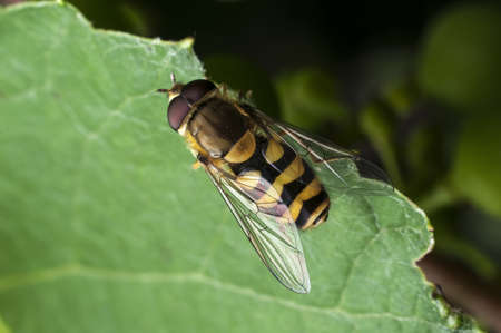 Gorgeous Syrphid posed on a green plant leaf with blured green background