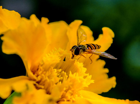 Hoverfly on yellow marigold flower. Shallow depth of field