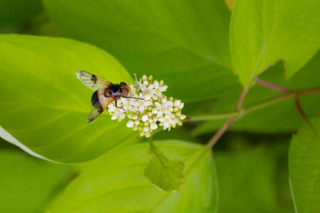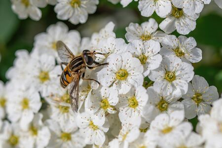 hoverfly on white spirea flowers. colorful photo of wildlife. macro photo of an insect. close-up. space for text. Helophilus pendulus. Hoverfly. sun fly.