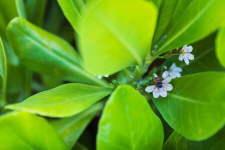 A Honeybee is pollinating tiny white flowers on this beach side plant. The bee was flying from flower to flower on this large plant. Wide back angle view.