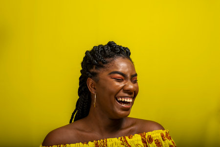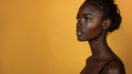 A beautiful black woman in profile on a vibrant yellow backdrop. Captivating with calm elegance, demonstrating confidence and serenity.
