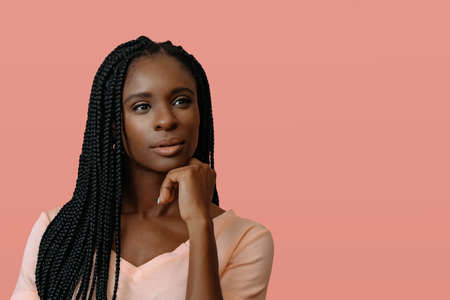 Stock photo of confident black woman with braids posing in studio shot against brown background.