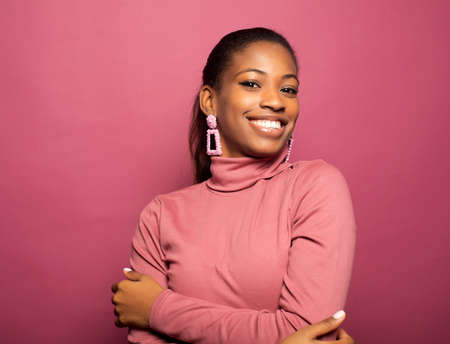 Portrait of young beautiful smiling dark skinned woman smiling and feel happy emotion isolated over pink background.