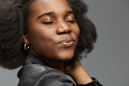 Portrait of a joyful Black woman with voluminous natural hair, dressed in a stylish blazer, exuding confidence and contentment against a neutral gray background