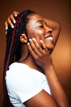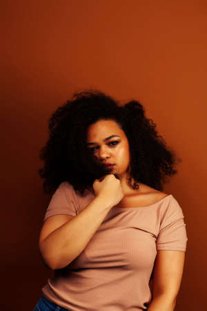 pretty young african american woman with curly hair posing cheerful gesturing on brown background, lifestyle people concept