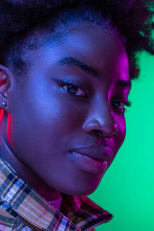 Close-up face of dark skinned young girl looking at camera isolated on dark green studio background in purple neon light.