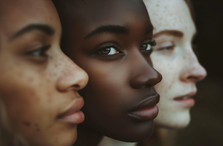Close-up side profile of three diverse women with different skin tones. Concept of unity, beauty, and diversity.