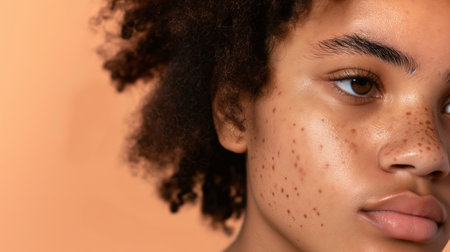 Vertical detail image of black young woman with real skin texture freckles and acne scars, minimal