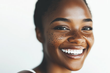 Minimalist close-up of a Black american woman with freckles on white background