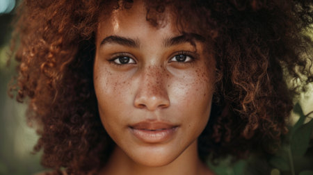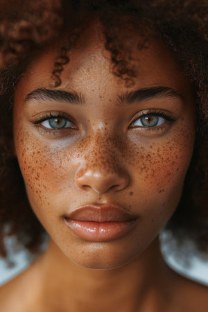 Close up portrait of beautiful African American woman with freckles