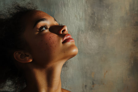 Close-up portrait of a woman with visible skin imperfections, conveying optimism, confidence, and self-acceptance through her upward gaze.