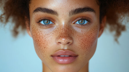 A young woman with striking blue eyes and freckles gazes intently at the camera against a softly lit background. Generative AI