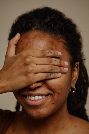 Close up portrait of ethnic young woman closing eyes with hand and smiling against neutral beige background, skin texture with acne scars
