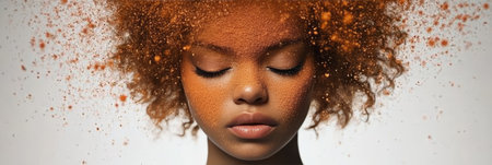 Serene Beauty Portrait of a Woman with Closed Eyes and Orange Powder Exploding from Hair