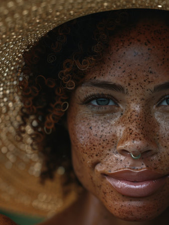 Close-up portrait of young african american woman with freckles on her face.