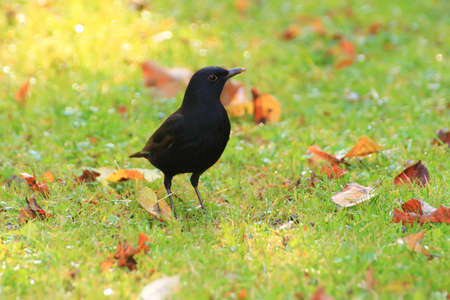 Blackbird Turdus merula sitting on a grass in the park.Wildlife photo
