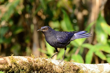 Blue whistling thrush (Myophonus caeruleus) mysterious dark blue bird with black bills morph perching on busy wooden branch in its bushy living habitate