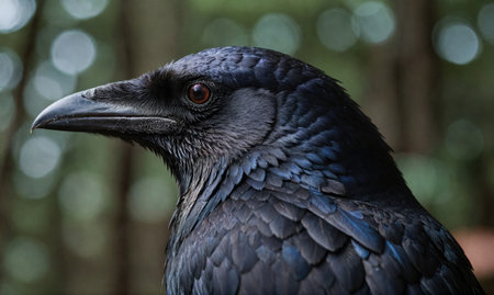 Detailed close up of a raven with a bokeh background in the forest