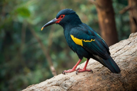 A selective focus shot of an exotic colorful bird on the thin branch of a tree in a forest