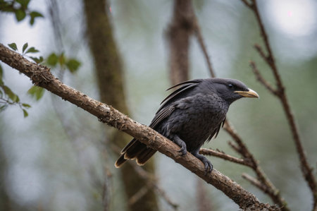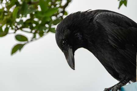 A black crow with shiny feathers on a branch