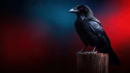 A black crow is perched on a wooden post. The image has a dark and mysterious mood, with the bird standing out against the red background