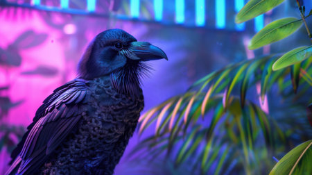 This stunning image showcases a majestic raven perched among lush tropical plants, illuminated by vibrant neon lights. The colorful light effects create an ethereal atmosphere, highlighting the bird's intricate feathers and the enchanting jungle environment. Ideal for wildlife and nature enthusiasts.