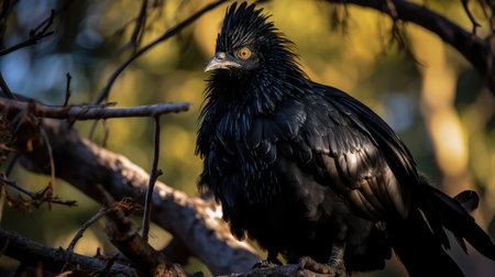 Sitting on a branch is a black palm cockatoo. Park with tropical birds. Nature and environment concept. Layout on the side. Bali, Indonesia. Generative AI