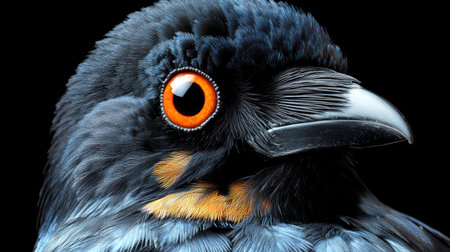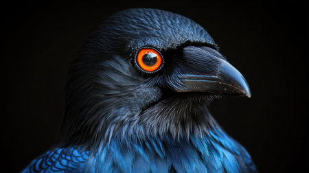 A close-up of a bird showcasing vibrant blue feathers and piercing orange eyes.