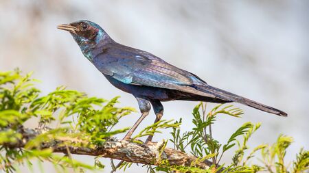 A male Common Grackle perched in front of a smooth out of focus background in the sun showing off its irridescence.