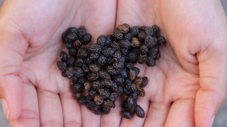 close up papaya fruit seeds on woman hand