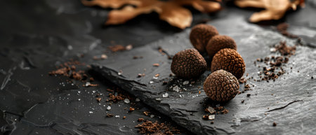 Freshly harvested truffles on a slate board, dark background, dramatic lighting