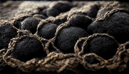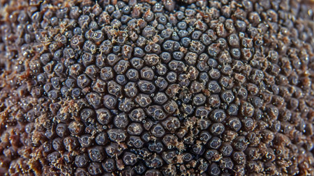 An extreme macro close-up of a rough, bumpy organic texture, resembling the surface of a black truffle or detailed biological skin. The intricate pattern of small, raised nodes creates an abstract natural background.