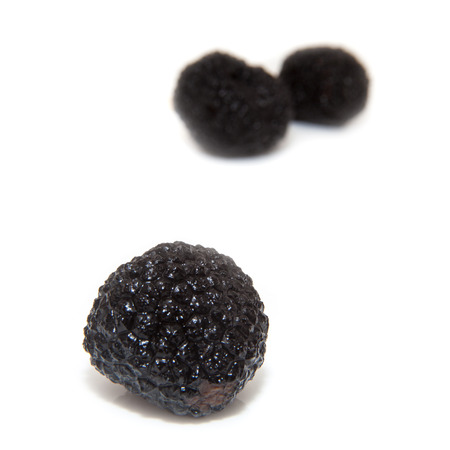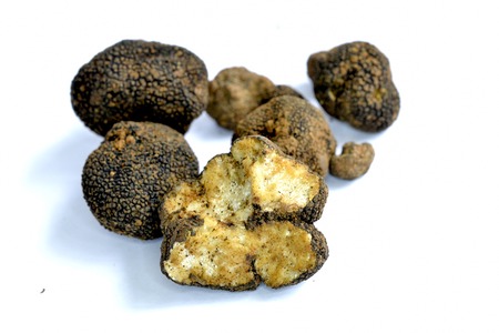 Closeup shot of black truffles on white background.