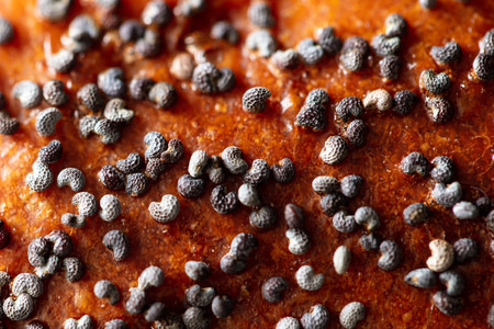 Whole wheat bread. Fresh loaf of rustic traditional bread with wheat poppy seeds in pattern of macro photography. Rye bakery with crusty loaves and crumbs. Homemade baking