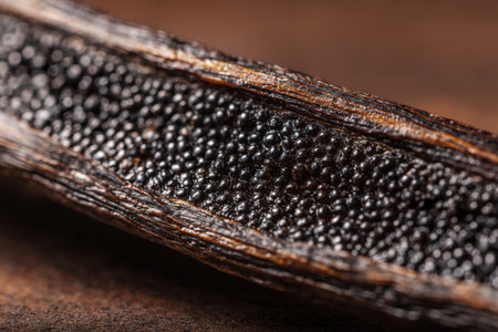 a macro shot reveals the intricate details of a vanilla bean pod, showcasing the tiny, aromatic seeds nestled within. the rich brown hues and textured surface invite culinary exploration and indulgence.