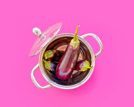 Ripe, whole eggplants are in a large saucepan. Food preparation concept. Flat lay. Top view.