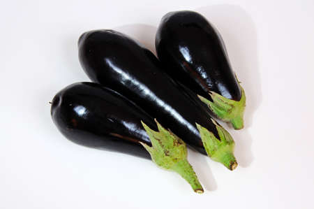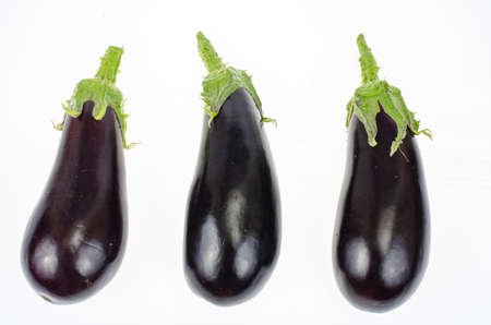 Three eggplant large to small on a white background, organic food concept, with place for text