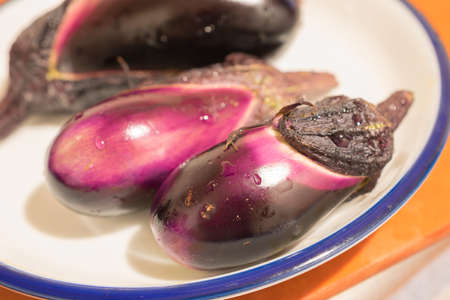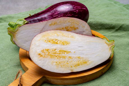 Fresh uncooked graffiti or Sicilian eggplants vegetables with purple and white stripes close up